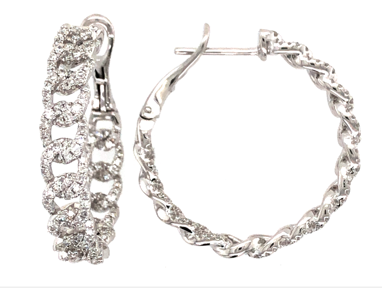 14W Pave Diamond Cuban Link Chain Hoop Earrings, D=1.27ctw