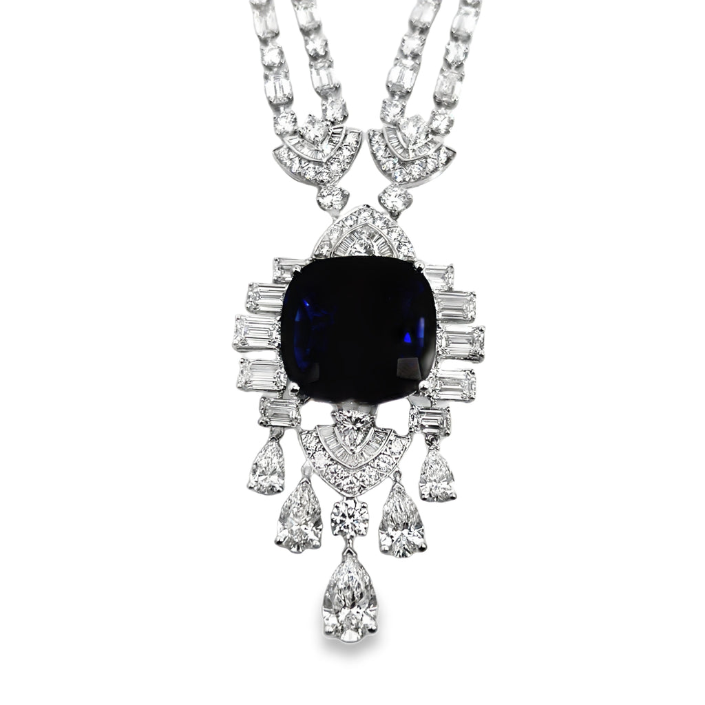 18W Cushion Cut Lab Grown Blue Sapphire and Diamond Fancy Necklace