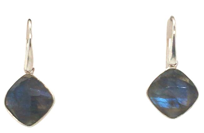 Sterling Silver Labradorite Bezel Set Square Cushion Checkerboard Dangle Earrings with Fish Hooks