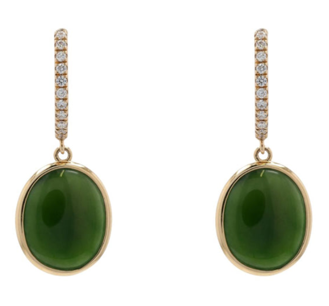 14Y Oval Jade with Diamond Huggie Dangle Earrings .13ctw