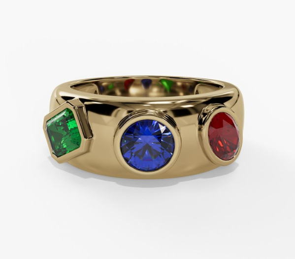 14Y Bezel Set Lab Grown Emerald Cut Emerald, Round Sapphire, Oval Ruby Band sz 7